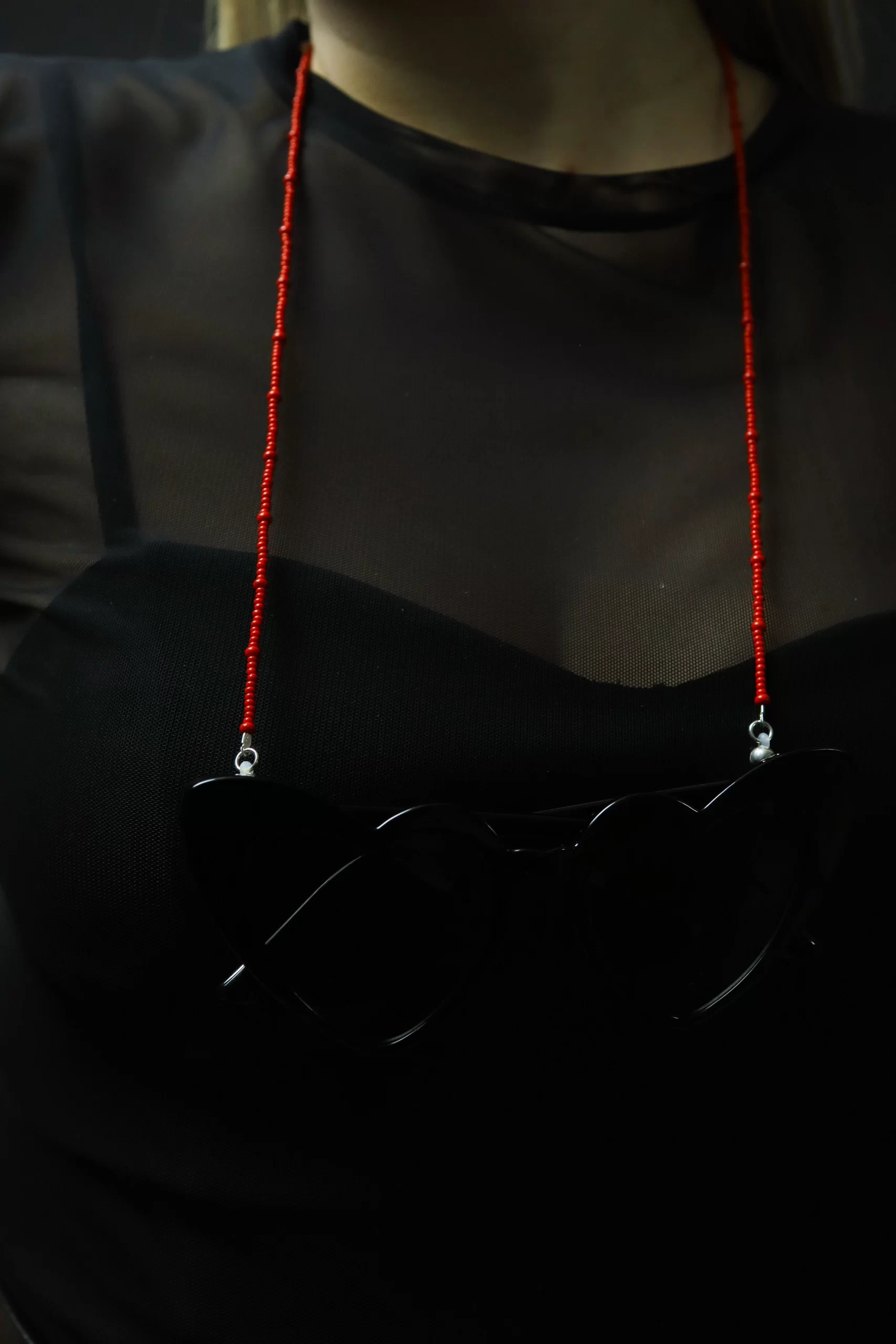 Ar rokām darināta briļļu ķēdīte ar sarkanām pērlītēm un furnitūru sudraba krāsā..